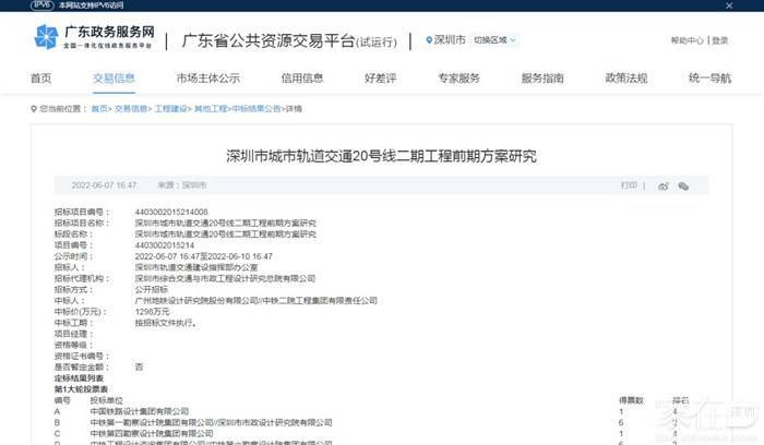 近日,深圳地铁15号线、17号线、20号线二期工程前期方案研究定标结果在广东省公共资源交易平台公示。