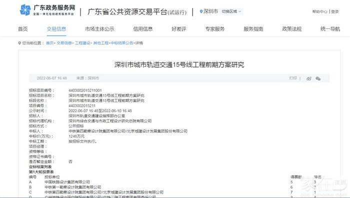 中标结果显示,深圳市城市轨道交通15号线工程前期方案研究,中标人为中铁第四勘察设计院集团有限公司//北京城建设计发展集团股份有限公司,中标价1248万元。