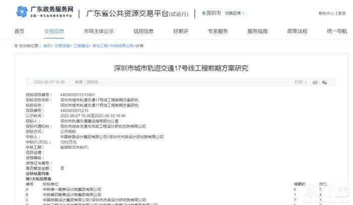 深圳市城市轨道交通17号线工程前期方案研究,中标人为中国铁路设计集团有限公司//深圳市市政设计研究院有限公司,中标价1265万元。
