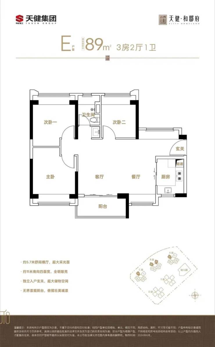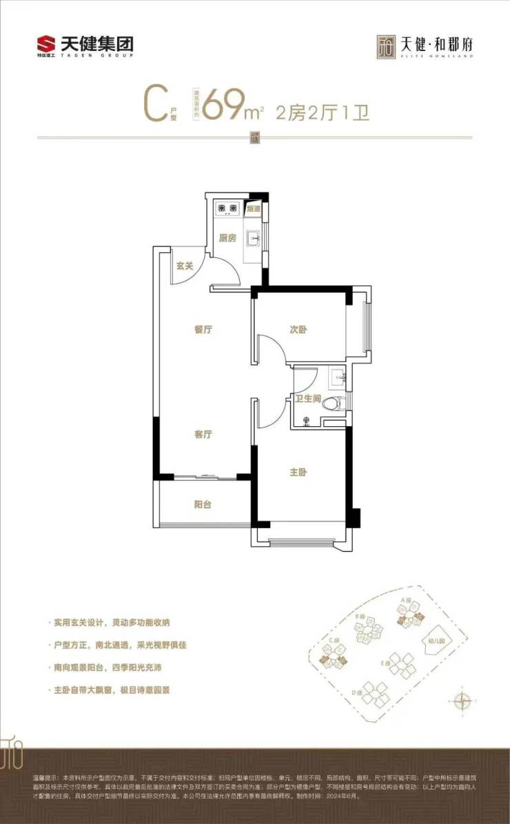 户型设计方面,项目每个卧室均带有飘窗,其中3房有两种格局,其中E户型是横厅设计,D户型是传统竖厅设计;2房只有竖厅一个格局。