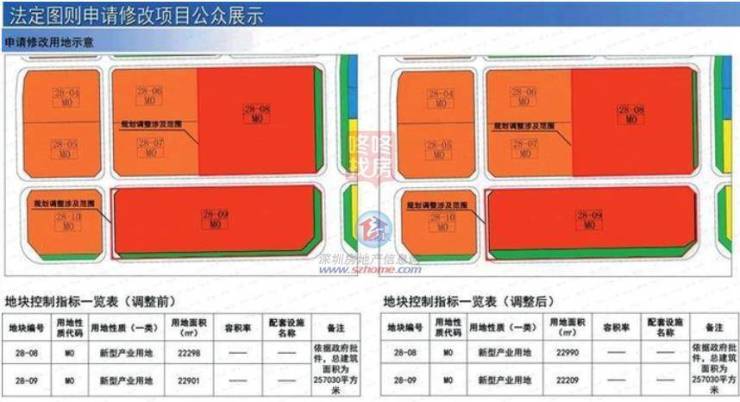 1.将[高新技术区]法定图则(修编)28-08地块用地面积由22298平方米调整为22990平方米,28-09地块用地面积由22901平方米调整为22209平方米。