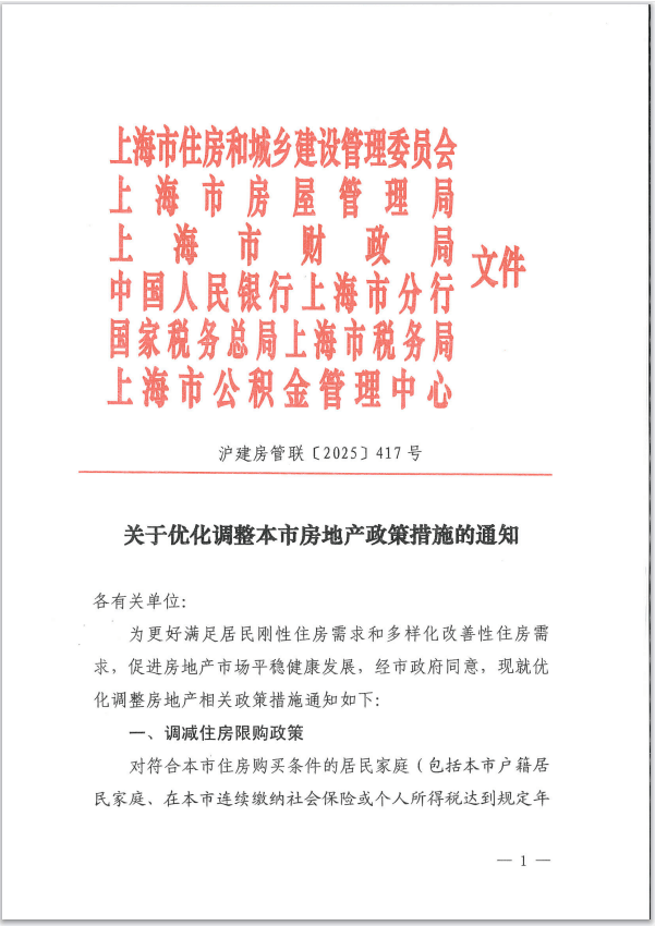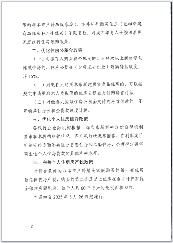 为更好满足居民刚性住房需求和多样化改善性住房需求,促进房地产市场平稳健康发展,8月25日,市住房城乡建设管理委、市房屋管理局、市财政局、市税务局、人民银行上海市分行、市公积金管理中心等六部门联合印发《关于优化调整本市房地产政策措施的通知》(以下简称《通知》),包括调减住房限购、优化住房公积金、优化个人住房信贷以及完善个人住房房产税等政策。《通知》自2025年8月26日起施行。