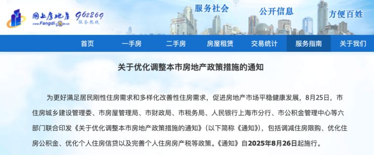 8月25日,上海市住房城乡建设管理委、市房屋管理局等六部门联合印发《关于优化调整本市房地产政策措施的通知》,涉及住房限购、公积金、住房信贷、住房税收等6项调整。新政自2025年8月26日起施行。