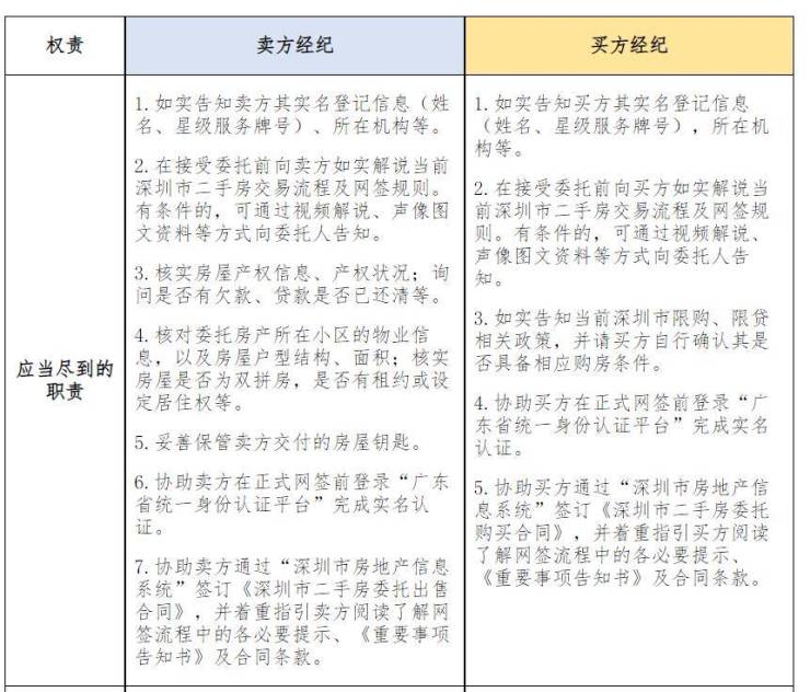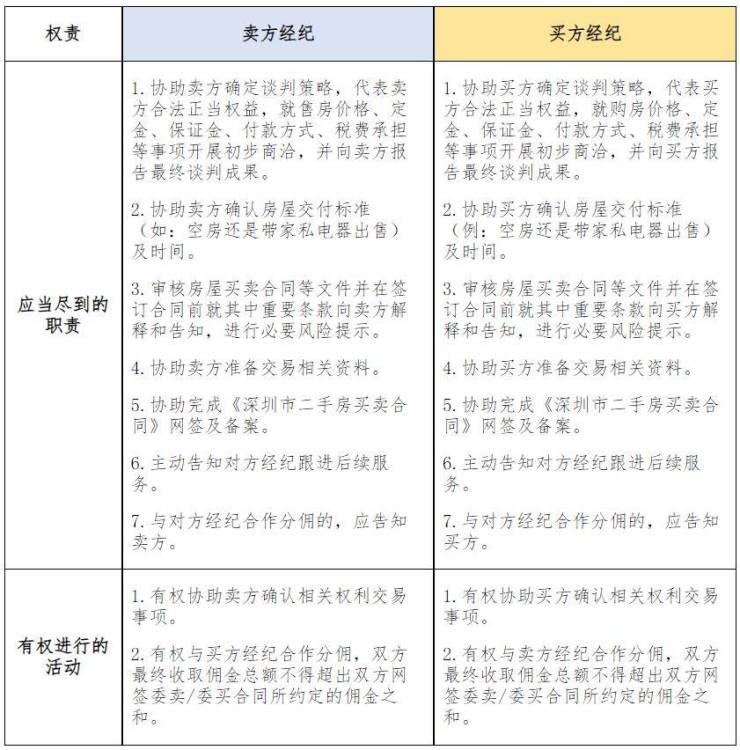 本表依据相关法律法规及深圳市二手房交易经纪服务实践,仅划分卖方/买方各自委托经纪方在各环节所应承担的最基准义务,及为配合二手房交易进行的必要权利,作为房地产交易纠纷调处的重要依据。实际交易与经纪服务过程中各方权责应依法定及实际协议约定为准。