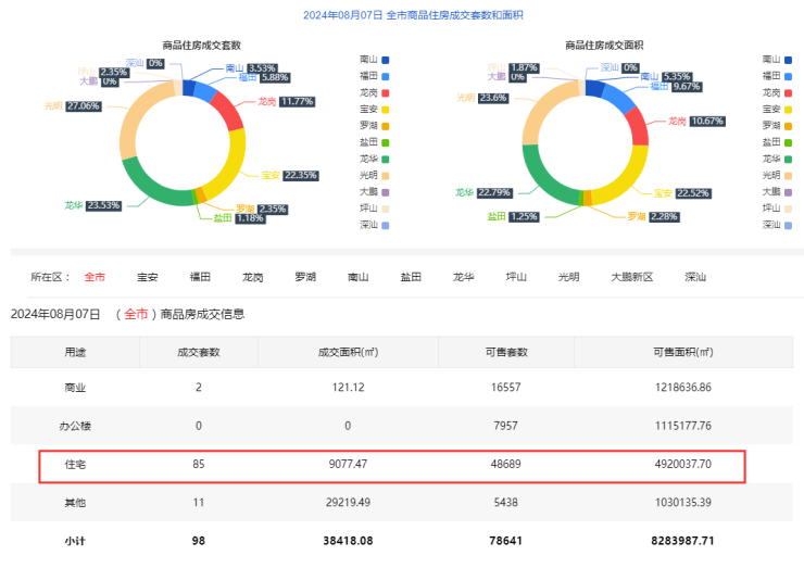 2024年8月7日新房住宅共网签85套。宝安19套;福田5套;龙岗10套;罗湖2套;南山3套;盐田1套;龙华20套;坪山2套;光明23套;大鹏0套;深汕0套。