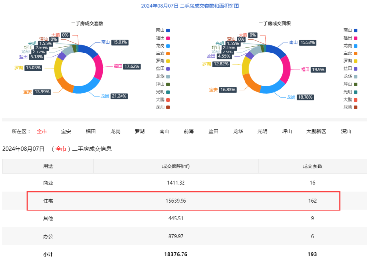 2024年8月7日二手房住宅网签162套。宝安23套;福田29套;龙岗37套;罗湖23套;南山23套;盐田6套;龙华13套;光明3套;坪山5套;大鹏0套。