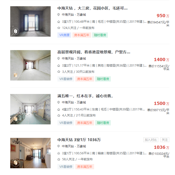 这位粉丝的朋友在16年的时候,以11.7万的单价投资了一套中海天钻的豪宅项目,总价1380万,几年下来,净亏损300万,现在挂牌9万多,还可能没人接手。