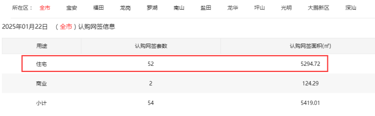 2025年1月22日新房住宅认购网签52套。其中,宝安7套;福田0套;龙岗9套;罗湖5套;南山0套;盐田0套;龙华9套;坪山3套;光明18套;大鹏1套;深汕0套。