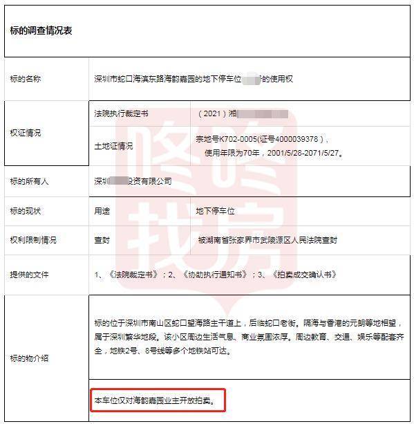 该批车位,是由湖南张家界某区人民法院查封。虽然停车位的使用权在深圳属于比较少有的资源,但是该批停车位也不是想拍就能拍,写明“车位仅对海韵嘉园业主开放拍卖”。