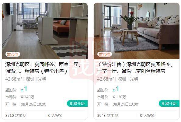 无独有偶,除了荔景新村小产权房外,光明奥园峰荟也将在8月24日、8月26日先后拍卖1套房源,起拍价也仅1元,但截至8月17日,还暂未有人报名。