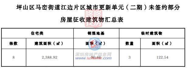据《补偿方案》内容显示,江边项目二期位于坪山区马峦街道比亚迪路与马峦北路(规划)交汇处东北方向,拟拆除重建用地面积为53645.51平方米, 总建筑面积为66730.41平方米(其中住宅66247.09平方米、办公483.32平方米)。