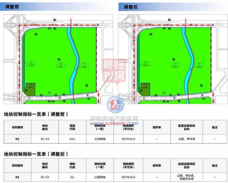 规划调整情况:将01-03地块用地性质按现行《深圳市城市规划标准与准则》调整为公园绿地(G1),配套设施中增设铁路存车场,其他规划指标不变。