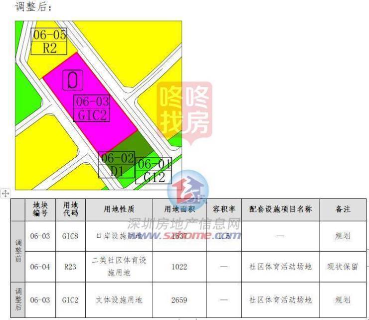 规划调整情况:拟将[沙头角地区]法定图则06-03地块口岸设施用地(GIC8)1637㎡、06-04地块二类社区体育设施用地(R23)1022㎡合并调整为文体设施用地(GIC2),地块编号保留为06-03,用地面积为2659㎡,不设容积率,配套设施项目名称为社区体育活动场地,备注“规划”。