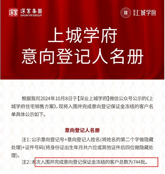 刚刚,深业上城学府公示意向登记名单,共有744批客户入围并冻资成功!深业上城学府共推出332套房源,如此来看,选房中签率约44.6%,极有可能实现日光!
