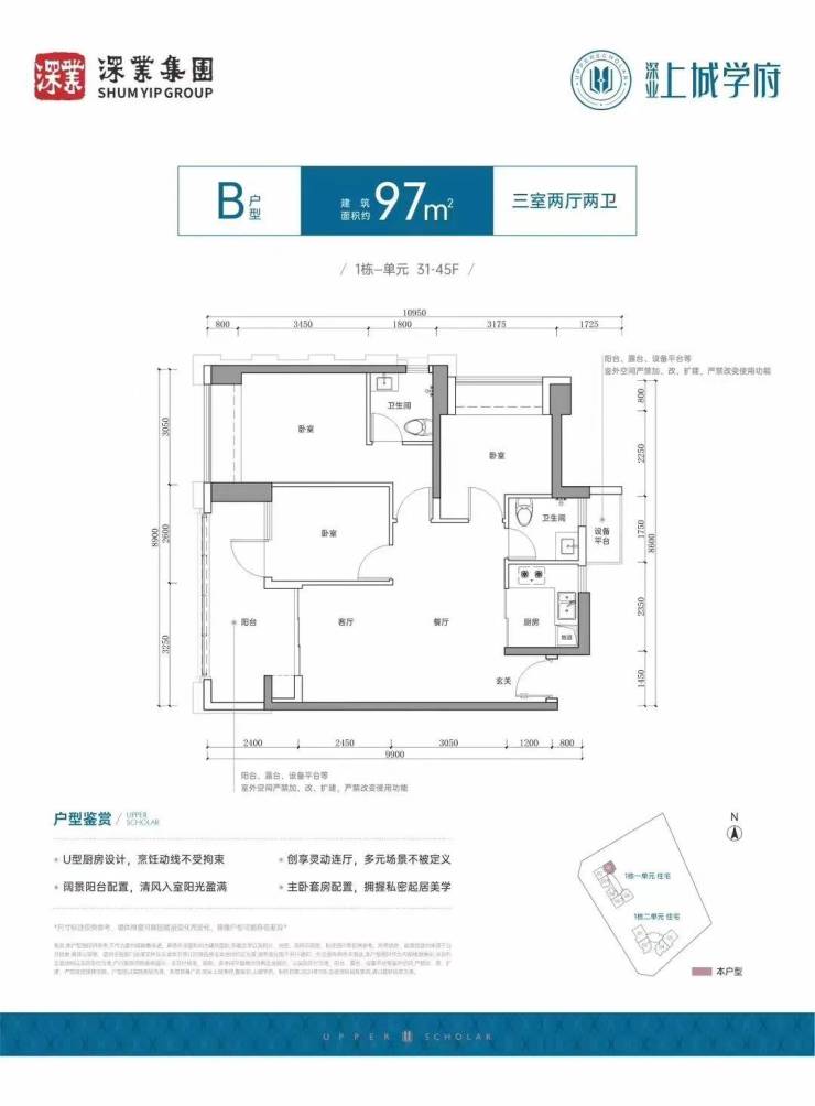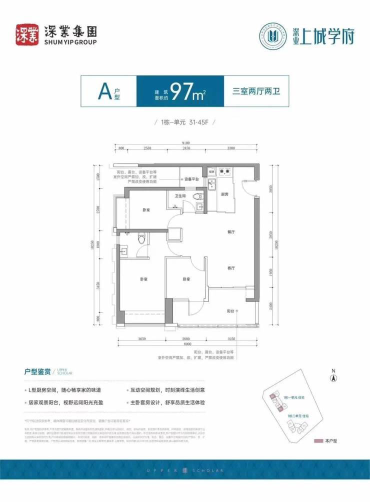 1栋一单元总层高45层,为3梯6户布局,主推建面约79/97㎡的产品;