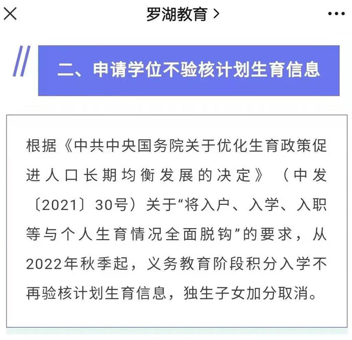 2、根据要求,从2022年秋季起,义务教育阶段积分入学不再验核计划生育信息,独生子女加分取消。