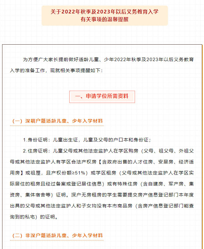 2月10日,宝安区发布关于2022年秋季及2023年以后义务教育入学有关事项的温馨提醒