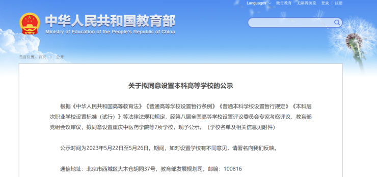 5月22日,教育部官网发布《关于拟同意设置本科高等学校的公示》,根据《中华人民共和国高等教育法》《普通高等学校设置暂行条例》《普通本科学校设置暂行规定》《本科层次职业学校设置标准(试行)》等法律法规和规定,经第八届全国高等学校设置评议委员会专家考察评议,教育部党组会议审议,拟同意设置重庆中医药学院等7所学校,现予公示。公示时间为2023年5月22日至5月26日。