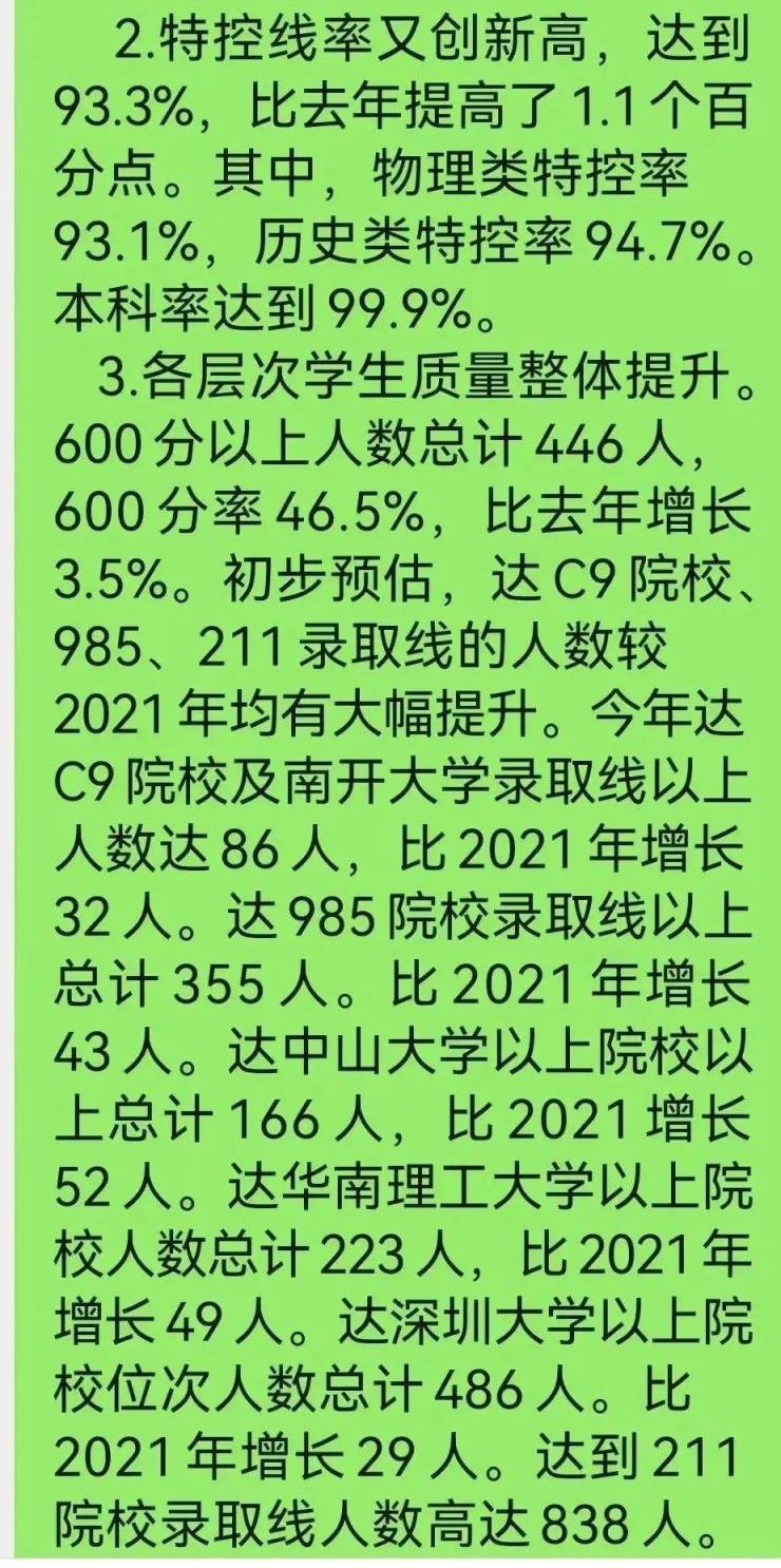 2022年高考600分以上213人,比去年增加46人。