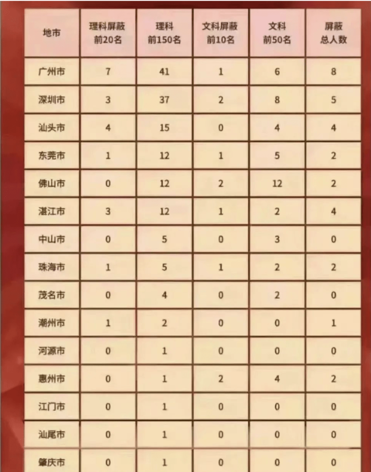 2022年,广东高考深圳市理科屏蔽前20名3人,前150名37人,文科屏蔽前10名2人,前50名8人,屏蔽生总人数5人。