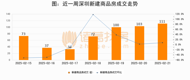 根据深圳市住房和城乡建设局数据显示,2025年02月21日深圳新建商品房成交111套,较昨日增加8套,环比上涨7.8%