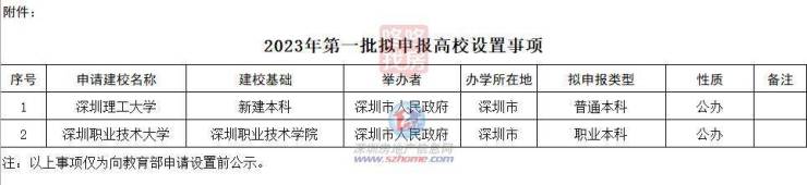 根据《中华人民共和国高等教育法》《普通本科学校设置暂行规定》《本科层次职业学校设置标准(试行)》等有关规定,为做好2023年第一批拟申报高校设置事项相关工作,经省高等学校设置评议委员会专家考察和评议,现对拟向教育部申报设立深圳理工大学等2个事项向社会公示。