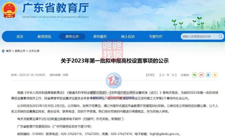 1月30日,广东教育局发布了关于2023年第一批拟申报高校设置事项的公示,公示时间为2023年1月30日-2月3日。