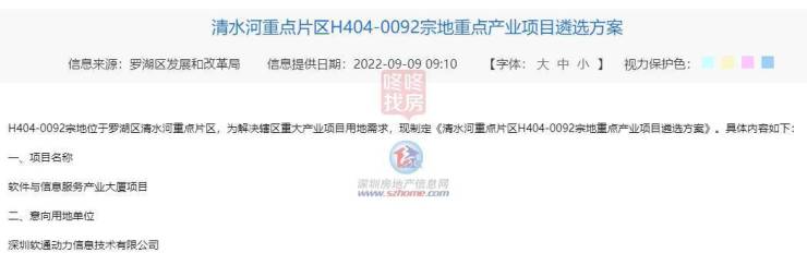 今年9月,罗湖区发展和改革局发布《清水河重点片区H404-0092宗地重点产业项目遴选方案》,项目名称为软件与信息服务产业大厦项目,意向用地单位为深圳软通动力信息技术有限公司。