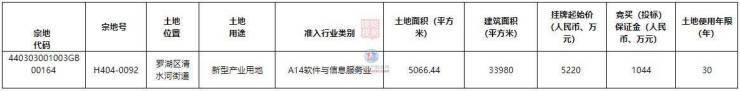 宗地号H404-0092,土地位置罗湖区清水河街道,土地用途新型产业用地,准入行业类别A14软件与信息服务业,土地面积5066.44平方米,建筑面积33980平方米,挂牌起始价5220万元,土地使用年限30年。