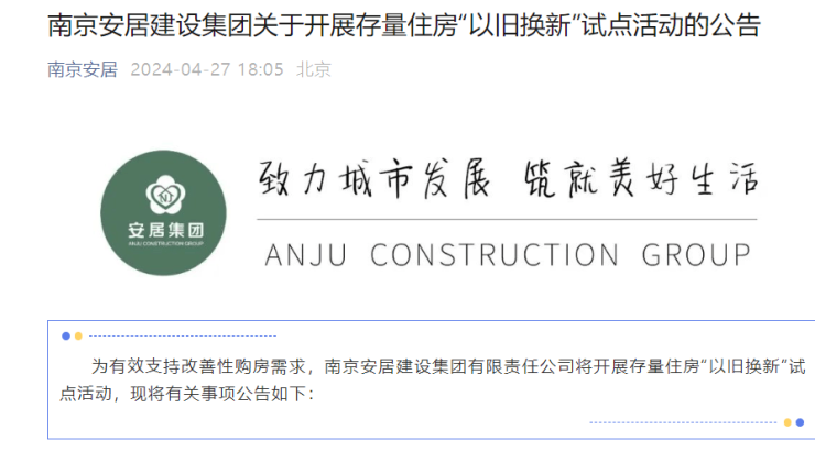 4月27日,南京安居建设集团在其官方微信公众号上宣布开展存量住房“以旧换新”试点。
