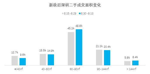 从成交的户型上来看,新政后15天置业者更倾向选择中大户型,其中60-90平方米成交占比为48.6%,环比扩大3.6%;其次是144平方米以上成交占比为6.4%,环比扩大0.8%。