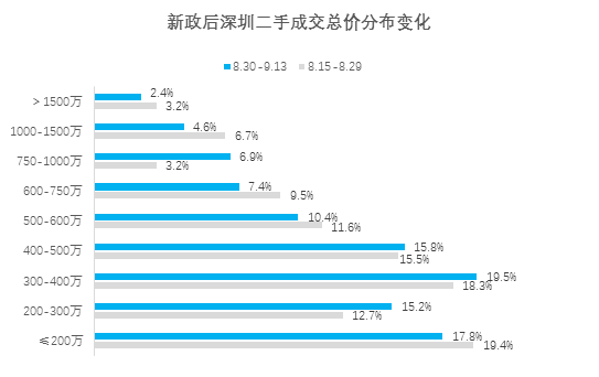 目前市场仍是以刚需成交为主,但新政后15天换房改善型需求加速释放,其中750-1000万元物业成交占比扩大3.8%,涨幅领先其他总价区间;其次是200-300万元,环比扩大2.5%。