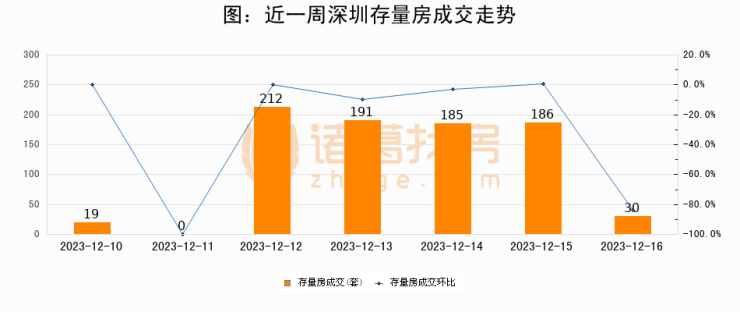 从存量房来看,2023年12月16日深圳存量房单日成交30套,比昨日减少156套,环比下降83.9%。从近一周存量房成交来看,深圳存量房日均成交套数为117套,12月16日单日成交30套,低于近一周平均水平74.4%。