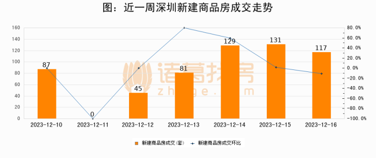 根据深圳市住房和城乡建设局数据显示,2023年12月16日深圳新建商品房成交117套,较昨日减少14套,环比下降10.7%