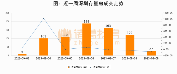 从存量房来看,2023年09月09日深圳存量房单日成交27套,比昨日减少95套,环比下降77.9%。从近一周存量房成交来看,深圳存量房日均成交套数为102套,09月09日单日成交27套,低于近一周平均水平73.5%。