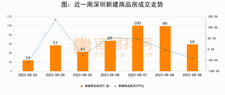 根据深圳市住房和城乡建设局数据显示,2023年09月09日深圳新建商品房成交59套,较昨日减少40套,环比下降40.4%