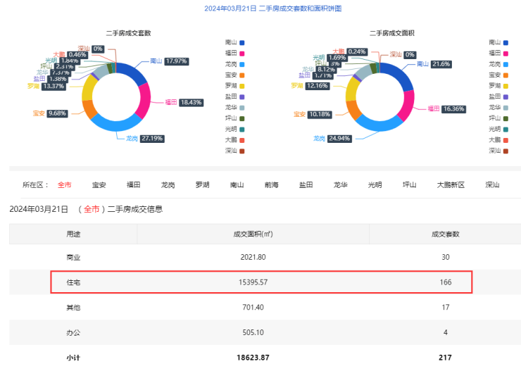 2024年3月21日二手房住宅网签166套。宝安21套;福田26套;龙岗39套;罗湖26套;南山31套;盐田3套;龙华14套;光明3套;坪山3套;大鹏0套。
