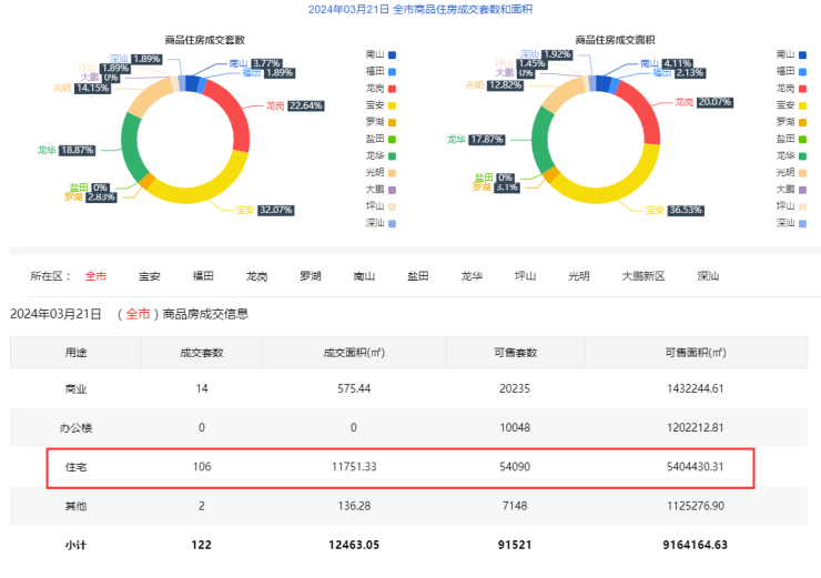 2024年3月21日新房住宅共网签106套。宝安34套;福田2套;龙岗24套;罗湖3套;南山4套;盐田0套;龙华20套;坪山2套;光明15套;大鹏0套;深汕2套。