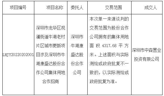 8月17日,牛湖老村片区城市更新项目涉及深圳市牛湖康盛达股份合作公司集体用地合作招商交易结果公告。