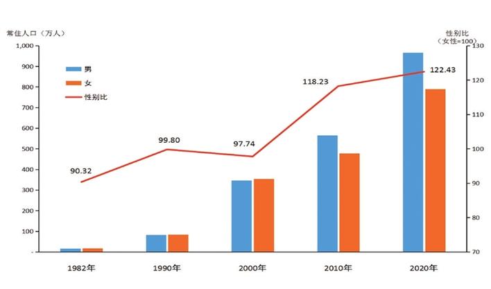 全市常住人口[2]中,男性人口为9665243人,占55.04%;女性人口为7894818人,占44.96%。总人口性别比(以女性为100,男性对女性的比例)由2010年第六次全国人口普查的118.23上升为122.43。
