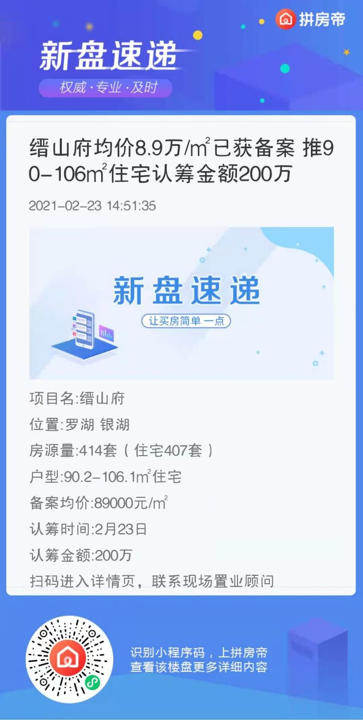 部分备案房源近两年,罗湖很少有新盘,所以区域内即将入市的缙山府,一直备受大家关注。2月19日,有网友爆料称收到缙山府项目销售发的信息,要求准备诚意金和购房资料,并表示项目近期或启动意向登记,诚意金200万。