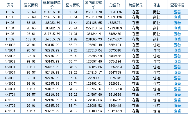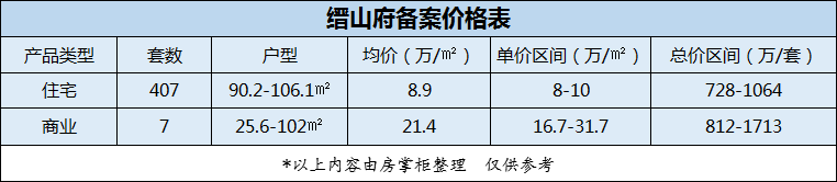 其中,住宅407套,户型建面约90.2-106.1㎡,均价约8.9万/㎡,单价约8-10万/㎡,总价约728-1064万/套。商业,共7套,户型建面约25.6-102㎡,均价约21.4万/㎡,单价约16.7-31.7万/㎡,总价约812-1713万/套。