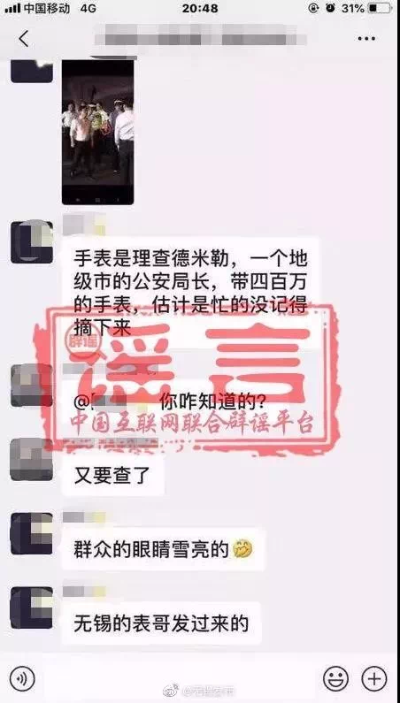 真相:11日凌晨,通报明确,事故共造成3人死亡,2人受伤。谣言2:10日晚8时许,在救援工作正紧张进行时,网上流传出一张事故救援现场的微信截图,并附有“手表是理查德米勒”、“一个地级市的公安局长,带四百万的手表,估计是忙的没记得摘下来”等谣言。