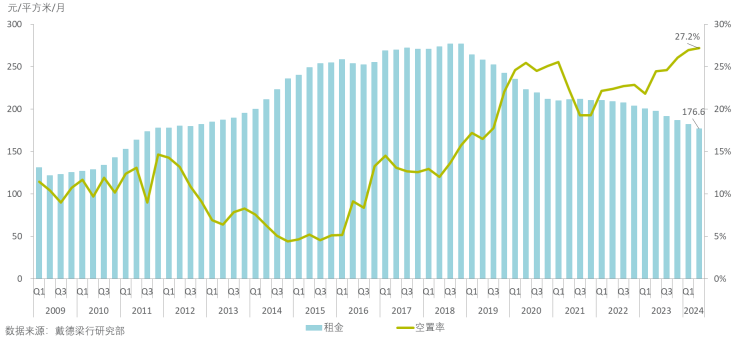 连续数年的高供应令市场去化持续承压,同时对宏观经济及部分行业的不明朗预期也令不少企业对办公面积的需求扩张乏力。在此背景下,不仅新项目面临招商压力,成熟项目亦需面对存量客户流失的难题,业主方不得不采取更加积极的招商去化策略吸引、挽留客户,包括:主动下调租金价格,对部分优质客户给予更具吸引力的租金折让;为租户提供半年甚至更长的免租期;为新租户提供拎包入住式的精装修出租服务,或与第三方装修公司合作为企业提供可分期支付的、灵活的装修方案等,以此满足当前企业审慎的运营策略下成本控制下的财务需要。以价换量的策略下,2024年中深圳甲级写字楼平均租金较2023年末下降5.3%至每月每平方米176.6元,同比下降10.6%。