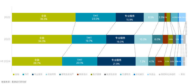 戴德梁行研究院副院长、华南及华中区研究部主管及董事张晓端分析了租赁需求的具体占比,2024上半年甲级写字楼租赁需求仍主要来自三大传统行业,总计占比超过7成。金融业占比达到28.7%,其中,传统金融业需求表现稳健,券商、银行、保险均录得大面积租赁成交。专业服务业占比21.9%,律所、战略咨询、人力资源服务保持一定的活跃度;同时成人教育、留学机构等需求增长也较为明显;办公空间运营类企业看好当前市场机会,寻租积极,业主方也较之前更加接受空间运营商的加入并与其共担风险。TMT行业占比20.1%,游戏、电商、半导体以及自动驾驶等板块贡献了部分大面积租赁成交。