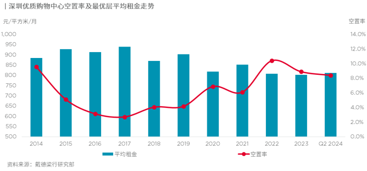戴德梁行大中华区副总裁、华南及华中区董事总经理程家龙表示,在粤港澳大湾区的融合发展的带动之下,跨境消费的活跃度有增无减,截至6月上旬,深圳今年出入境人次已破亿,较2023年提前3个月实现;2024年一季度深圳入境过夜游客数量为195.25万人次,其中港澳同胞占比86.6%。作为港人短途旅游主要目的地之一的深圳,港人北上对零售及相关服务性消费活跃度的提升在临近口岸及轨道交通节点的综合类购物中心更加显著。受益于新增客流带来的稳定增长的消费需求,品牌租户对优质购物中心的租赁需求使得存量空置面积得以继续去化,深圳优质购物中心年中整体空置率较去年末下降0.5个百分点至8.4%;全市优质购物中心最优层平均租金半年提升1.1%至每月每平方米812.1元。