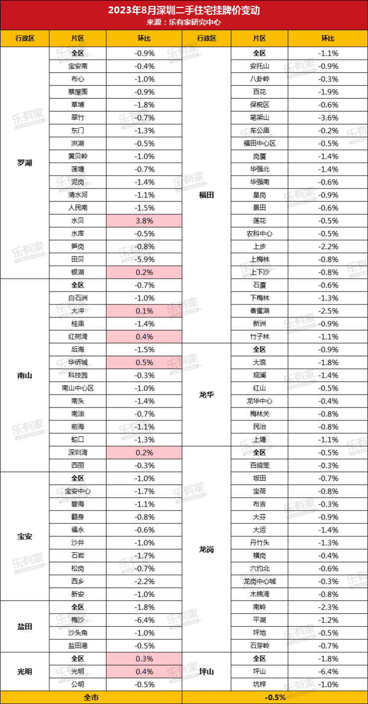 8月业主心态更加走低,片区挂牌价大面积下跌。全市挂牌均价环比再跌0.5%,已经连续2年下滑。除了7个片区的价格能维稳止跌,剩余片区挂牌价均是持续下行,跌幅多在1-2%。看似只是微量的下调,但每月持续减少,长期积累下来业主报价已经有较大的降幅。