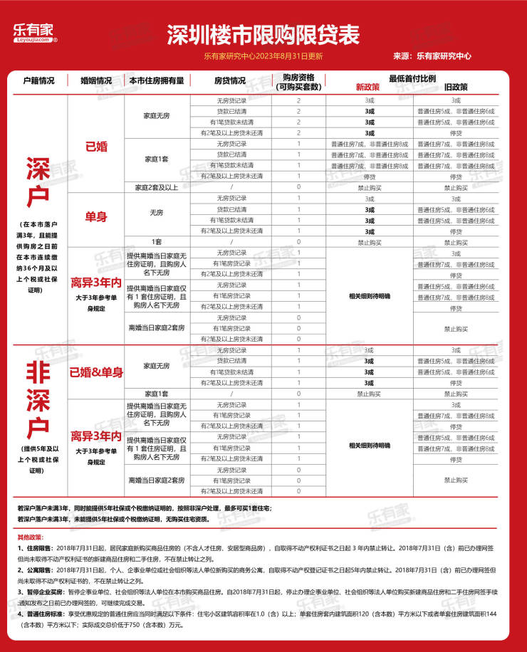 该政策的实施,也意味着深圳执行了3年的最严住房贷款政策终于有所宽松。乐有家研究中心根据新政及银行细则,最新限购限贷政策表如下: