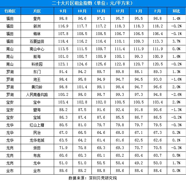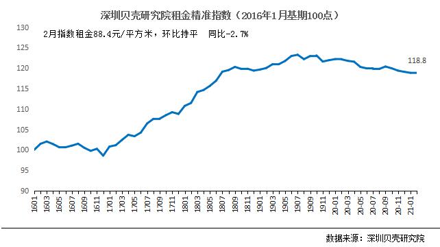 租金方面,深圳贝壳研究院长期监测约430个样本楼盘租金,2月租金指数为118.8点,样本租金88.4元/平方米,环比止跌持平,同比下跌2.7%,连续10个月下跌。