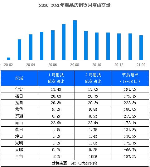 据分析,年底不少市民为响应政府号召,决定留深过年,因而换租需求提前。再者,节后离深市民返回与新增人口的流入,产生了新租需求。此外二手房参考价新政的出台,令市场出现“由买转租”的现象。因而随着新租、换租需求的增加,租赁市场热度走高。